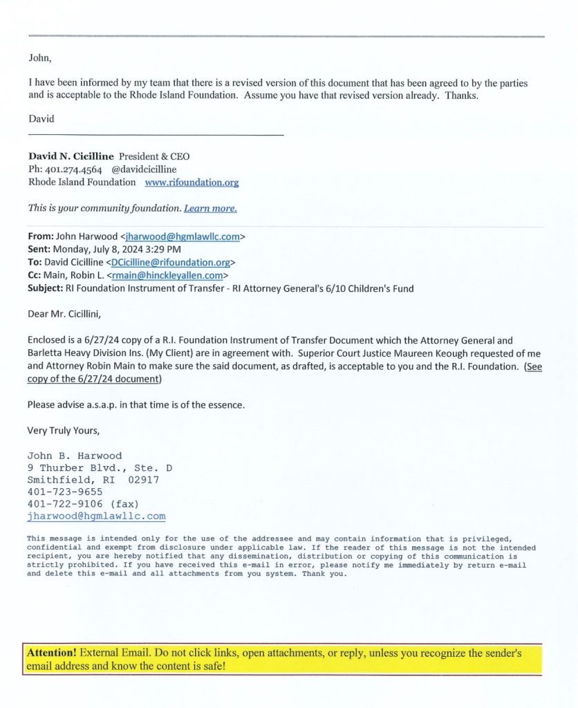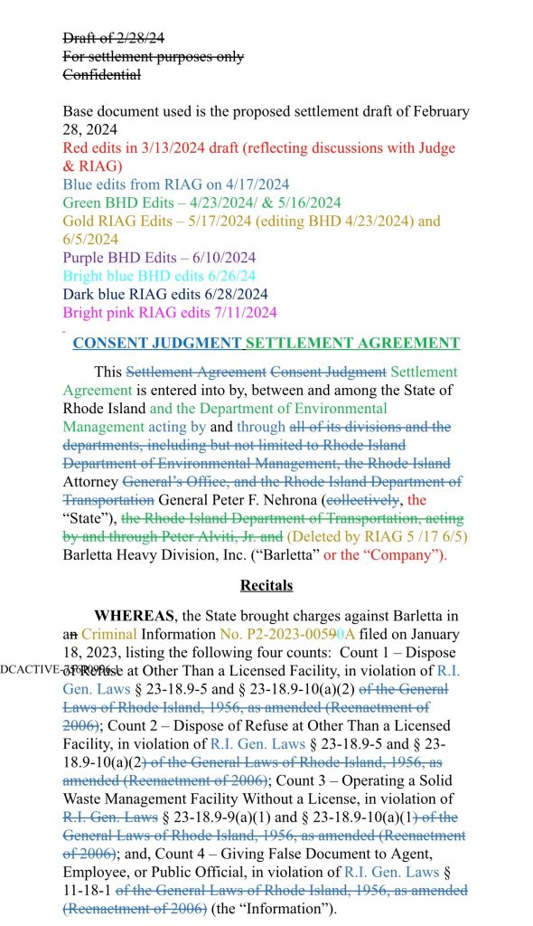 By spring 2024, the $10 million offer was still on the table, but negotiations stalled over contract language. E-mails from May 2024, posted here, show Barletta never withdrew the 2022 offer. This contradicts Neronha’s statements accusing Barletta of withdrawing the offer. Instead, the AG’s office sought to doctor the agreement by removing “solid waste” and “contamination” from the three-year-old settlement document. These changes allowed for the funds to go to the Rhode Island Foundation and not the tax payers.