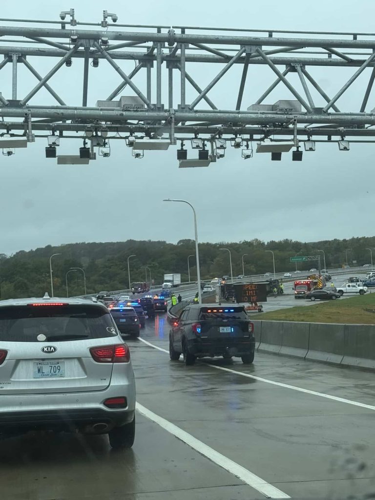 The crash blocked the right lane and brought a large response from first responders, who were seen working at the site of the overturned bus. Traffic in the area was significantly slowed as crews arrived to assess the situation.