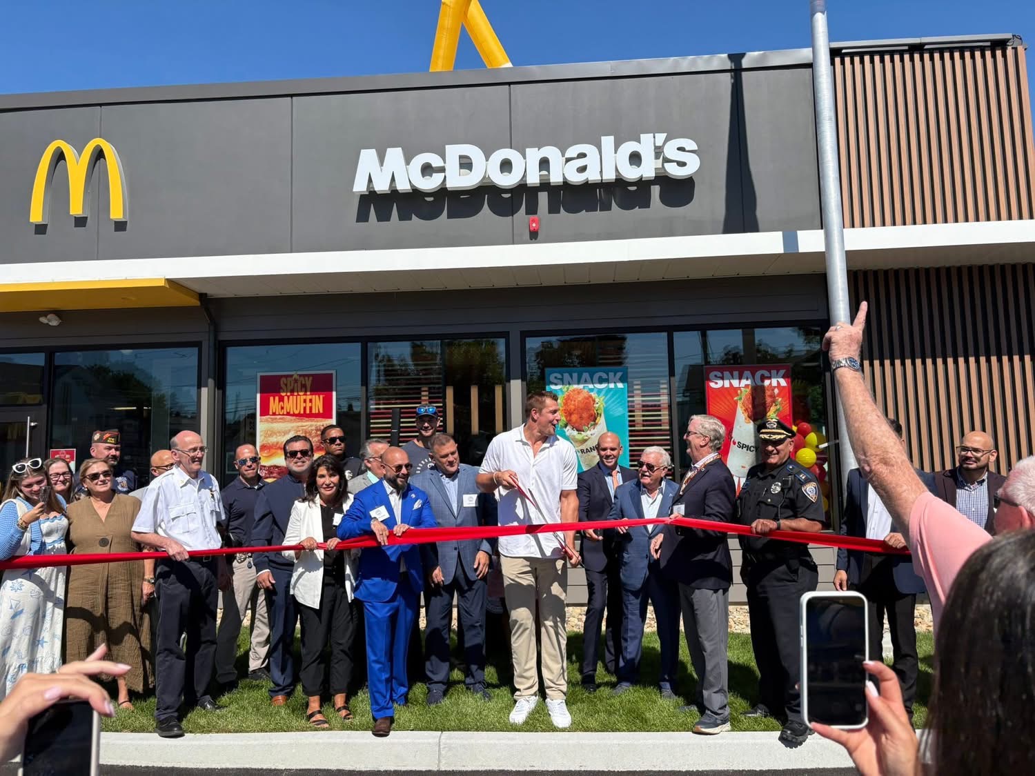 CRANSTON, R.I. — Former New England Patriots star tight end Rob Gronkowski was in Cranston this morning cutting the ribbon at the grand re-opening of the McDonald’s at 923 Cranston Street.